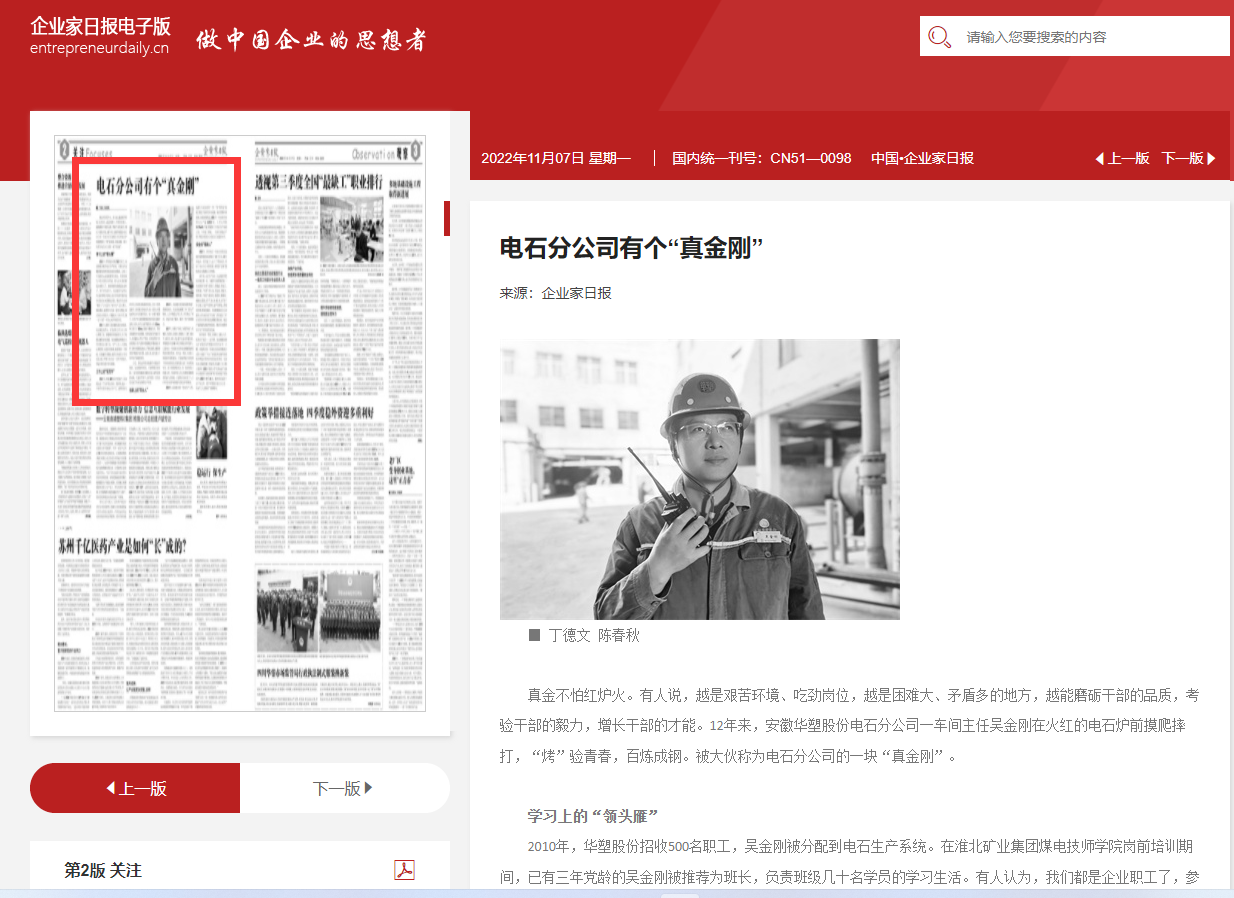 《企业家日报》11月7日二版头条:电石分公司有个“真金刚”