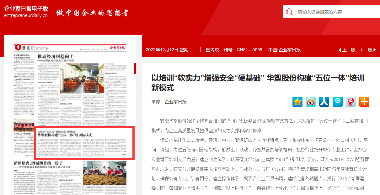 《企业家日报》12月12日四版:以培训“软实力”增强安全“硬基础” yd2333云顶电子游戏股份构建“五位一体”培训新模式